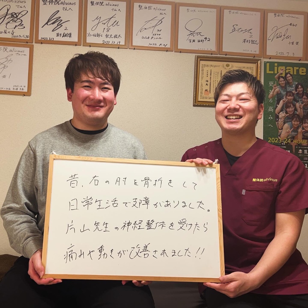 幼い頃、右肘の怪我をして後遺症が残り、痛みなどが出て日常生活に支障がありました。整形外科でリハビリもやりましたがあまり改善されず…。このまま良くならないのかと諦めていましたが、片山先生の神経整体を受けて、今まで大きな変化がなかった肘が良くなってきました!痛みを繰り返さないためにも定期的に通院してメンテナンスをしたいと思います。