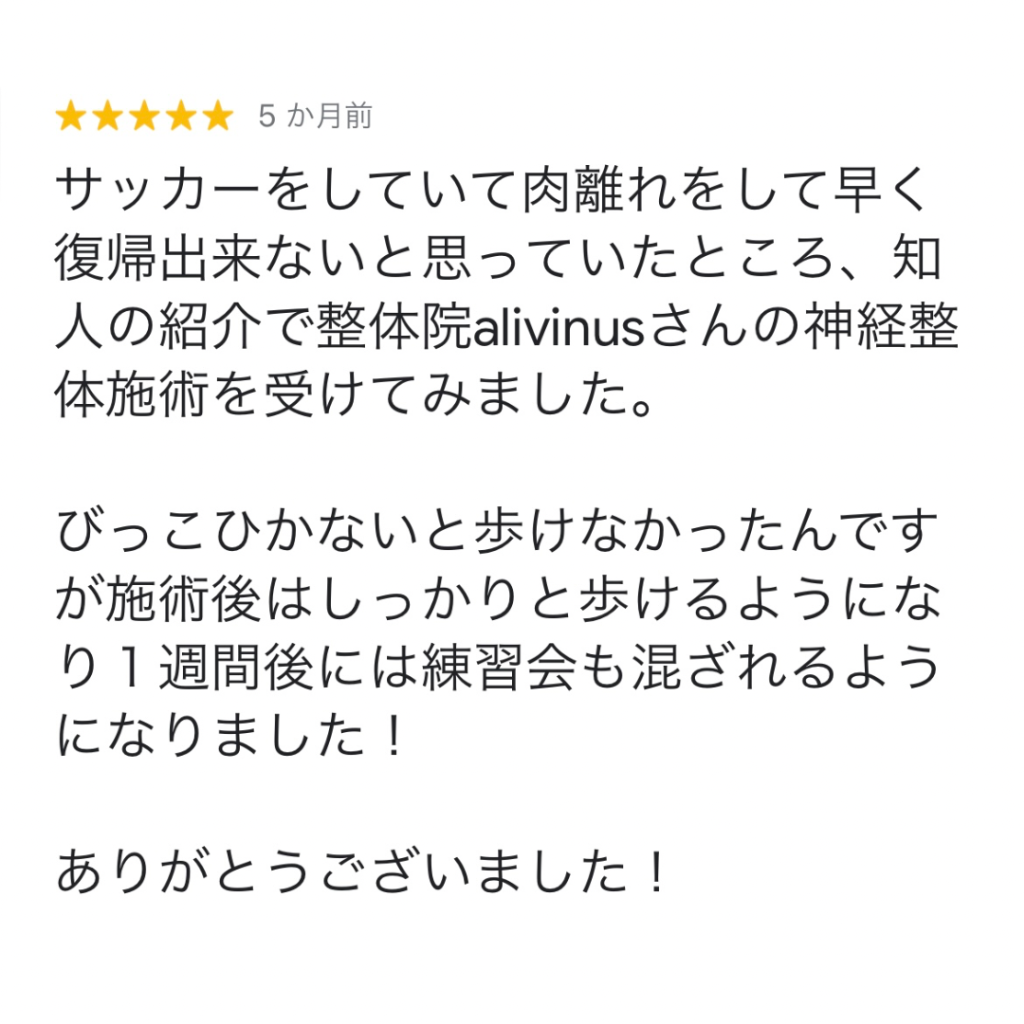 サッカーをしていて肉離れをして早く復帰出来ないと思っていたところ、知人の紹介で整体院alivinusさんの神経整体施術を受けてみました。