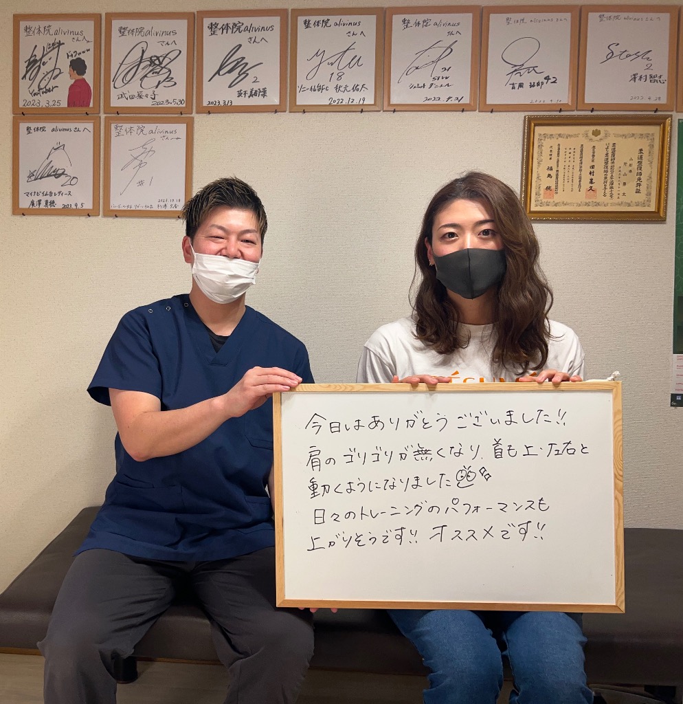 しっかり施術後は、首の詰まりもなくなり肩を回してもゴリゴリ鳴らなくなりスムーズに動かすことが出来るようになりました🤗