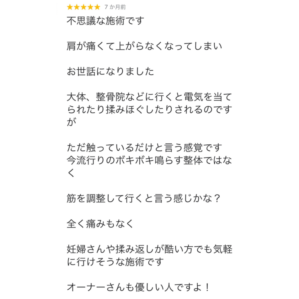 痛みなく優しく触れてるんですが、可動域が改善されたり痛み、コリも改善していきます!