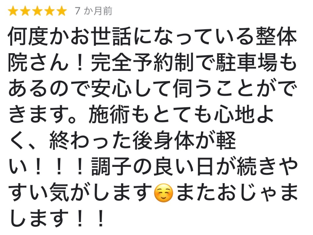 何度かお世話になっている整体院さん!完全予約制で駐車場もあるので安心して伺うことができます。施術もとても心地よく、終わった後身体が軽い!!!調子の良い日が続きやすい気がします☺️またおじゃまします!!