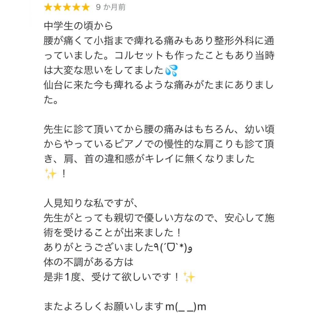 先生に診て頂いてから腰の痛みはもちろん、幼い頃からやっているピアノでの慢性的な肩こりも診て頂き、肩、首の違和感がキレイに無くなりました✨!