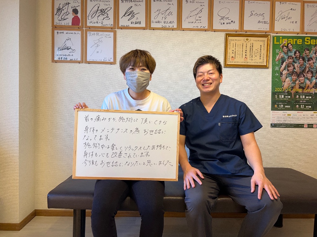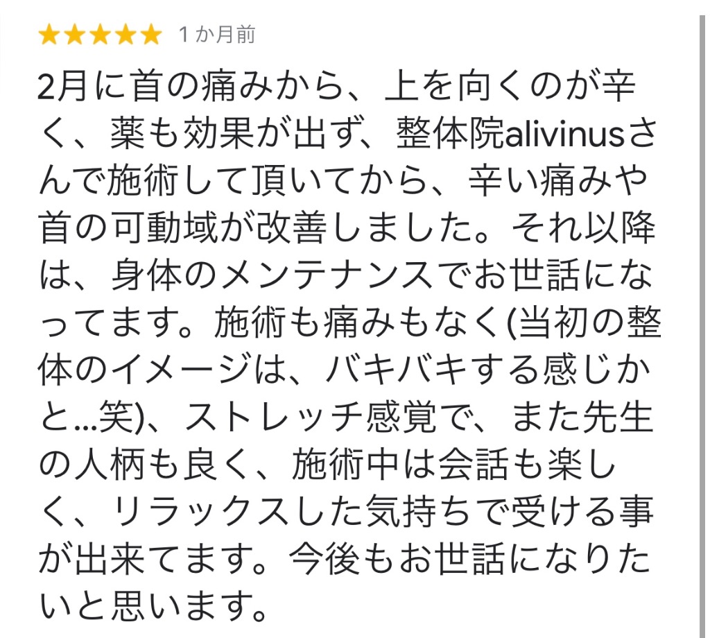 2月に首の痛みから、上を向くのが辛く、薬も効果が出ず、整体院alivinusさんで施術して頂いてから、辛い痛みや首の可動域が改善しました。それ以降は、身体のメンテナンスでお世話になってます。施術も痛みもなく(当初の整体のイメージは、バキバキする感じかと…笑)、ストレッチ感覚で、また先生の人柄も良く、施術中は会話も楽しく、リラックスした気持ちで受ける事が出来てます。今後もお世話になりたいと思います。