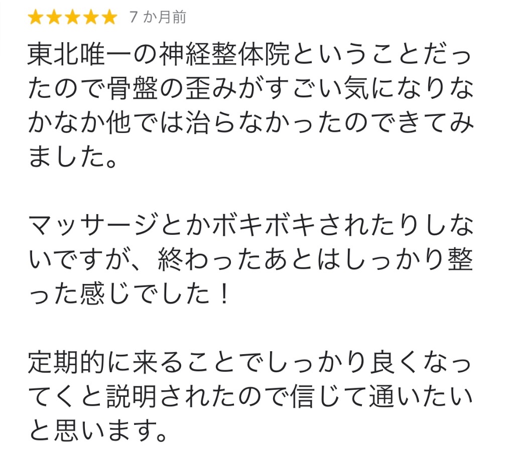 東北初の神経整体院ということだったので骨盤の歪みがすごい気になりなかなか他では治らなかったのできてみました。